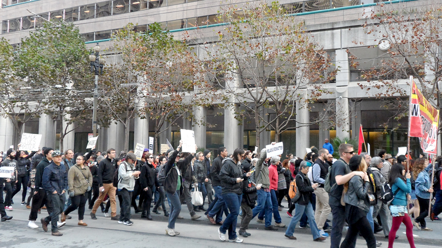 The march passes the Federal Reserve, ground zero of 2011's Occupy SF movement.